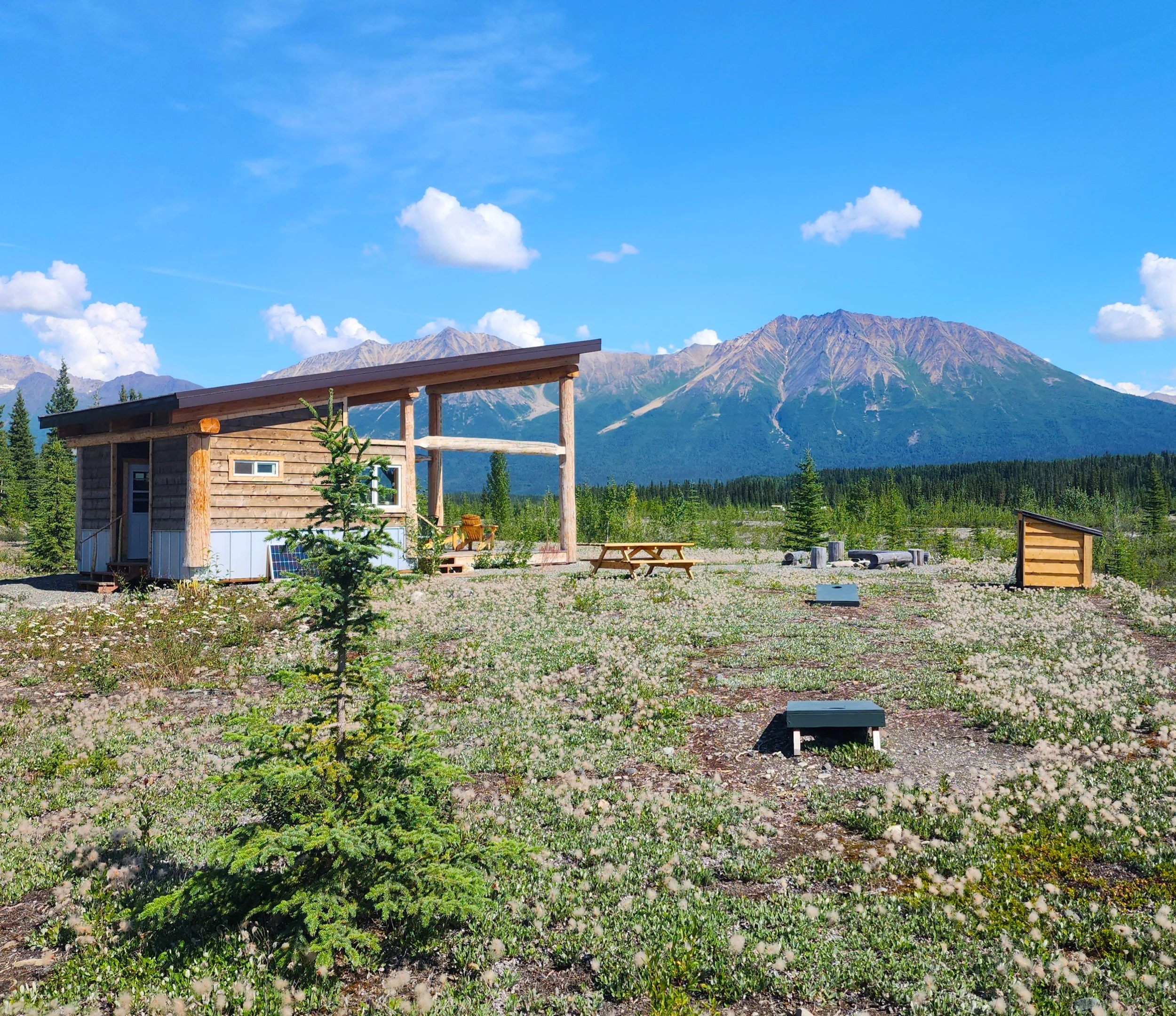 The Pavilion is a welcoming place to read, play cards, share stories, or simply unwind to the sound of the river beneath wide Alaska skies.